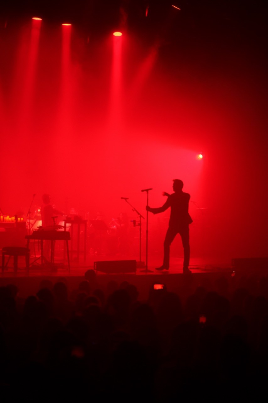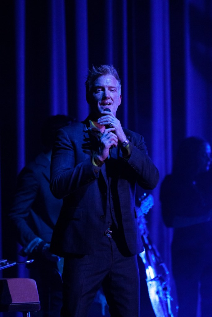 In a program broken up into three acts, the conceptual concert opened in chamber rock fashion, with newly arranged versions of songs featuring a string quartet, subtle keyboards, and spare percussion versus a standard bashing drum kit effect. A dim-lit, dark horse cabaret atmosphere prevailed in the house, with Homme introducing the evening by slinking down the aisle while easing into a medley of “Running Joke” and “Paper Machete.” He took on the persona of a Weill-ish, Weimar Republic–an character, or something out of Sondheim’s Sweeney Todd, even wielding a menacing meat cleaver as a prop. Yes, he was the demon troubadour of State Street.