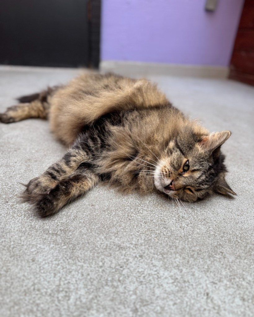Harry is a big, handsome Maine Coon estimated to be around 12-16 years young! This lovely senior kitty has a small benign skin mass on his lip, but that doesn’t affect his charm one bit.