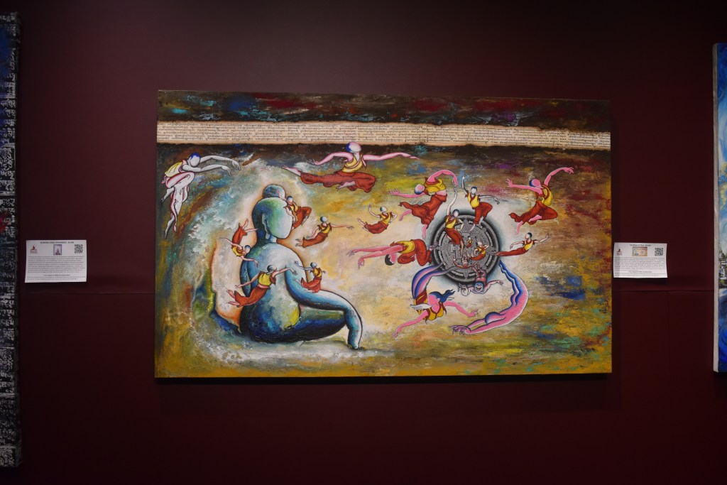 Around the gallery, Norbu’s paintings lined the walls, inviting viewers into a world where tradition and modernity intertwine. Wave-like depictions of the Buddha, vibrant color fields, and surreal abstract imagery blend ancient Tibetan Buddhist symbolism with a contemporary, expressive style.