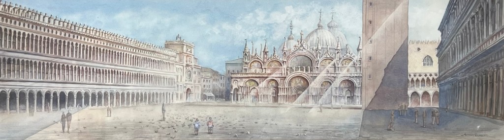 What’s the story beyond your watercolor of Venice’s St. Mark’s Square? During my semester in Italy, I visited Venice with my wife and our four sons. The painting depicts our 3-year-old and 4-year-old chasing pigeons in the square (which they loved doing in any piazza). It was a gift for my wife, and definitely one of my best pieces.