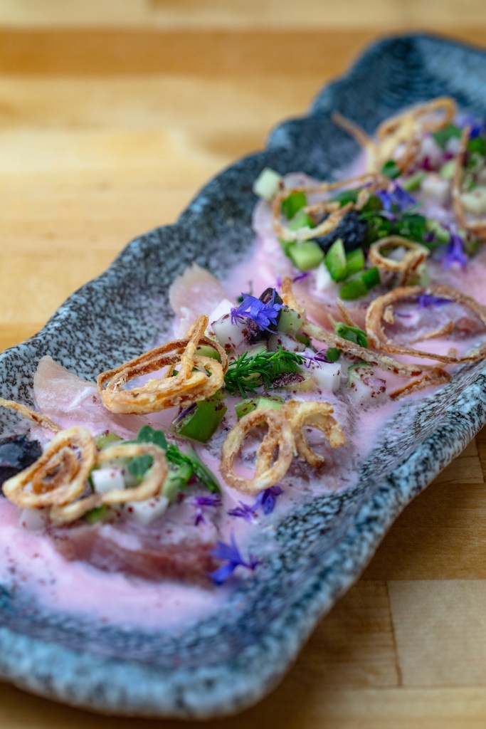 We also opted for the şalgam crudo, a picture-perfect plate of koji-cured hamachi, şalgam leche de tigre, pickled blueberry salsa, crispy garlic, and cilantro blossom. Onoglu’s attention to detail is laser-focused. He’s sure to source his fish from either the Santa Barbara Fish Market or from Santa Barbara Fish Mongers.
