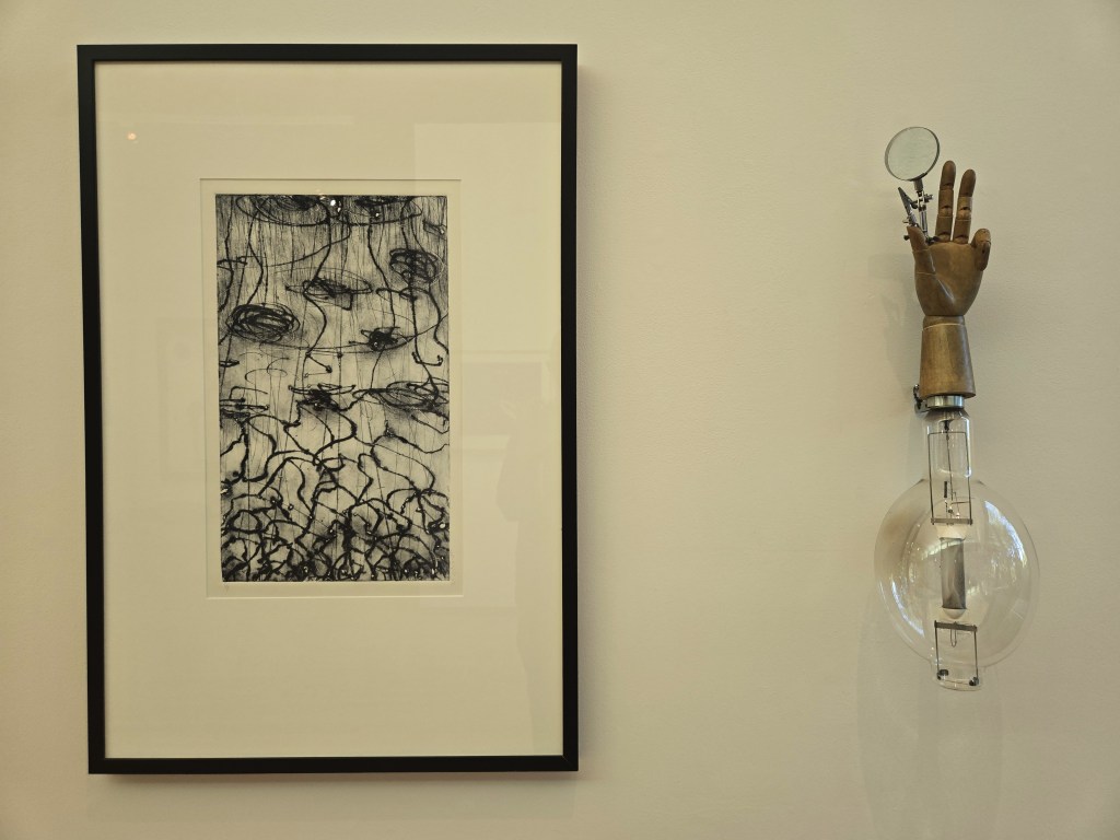 In the exhibition, a particular intrigue rises from insights into the twists of visual imagination from sculptors when limited to simple, flat expressive circumstances. Oldenburg’s “Sketch for a Sculpture in the Form of a Steel Tack” is a radically scaled-down game plan for what would become one of his famed epic visions of everyday objects — in this case, a lowly but beautiful thumbtack. Bourgeois is known for her complex structures — complex, physically, emotionally, and referentially — but here is seen via “Feet (from 11 Drypoints),” a study of said body part, tracing her early traumas in life.