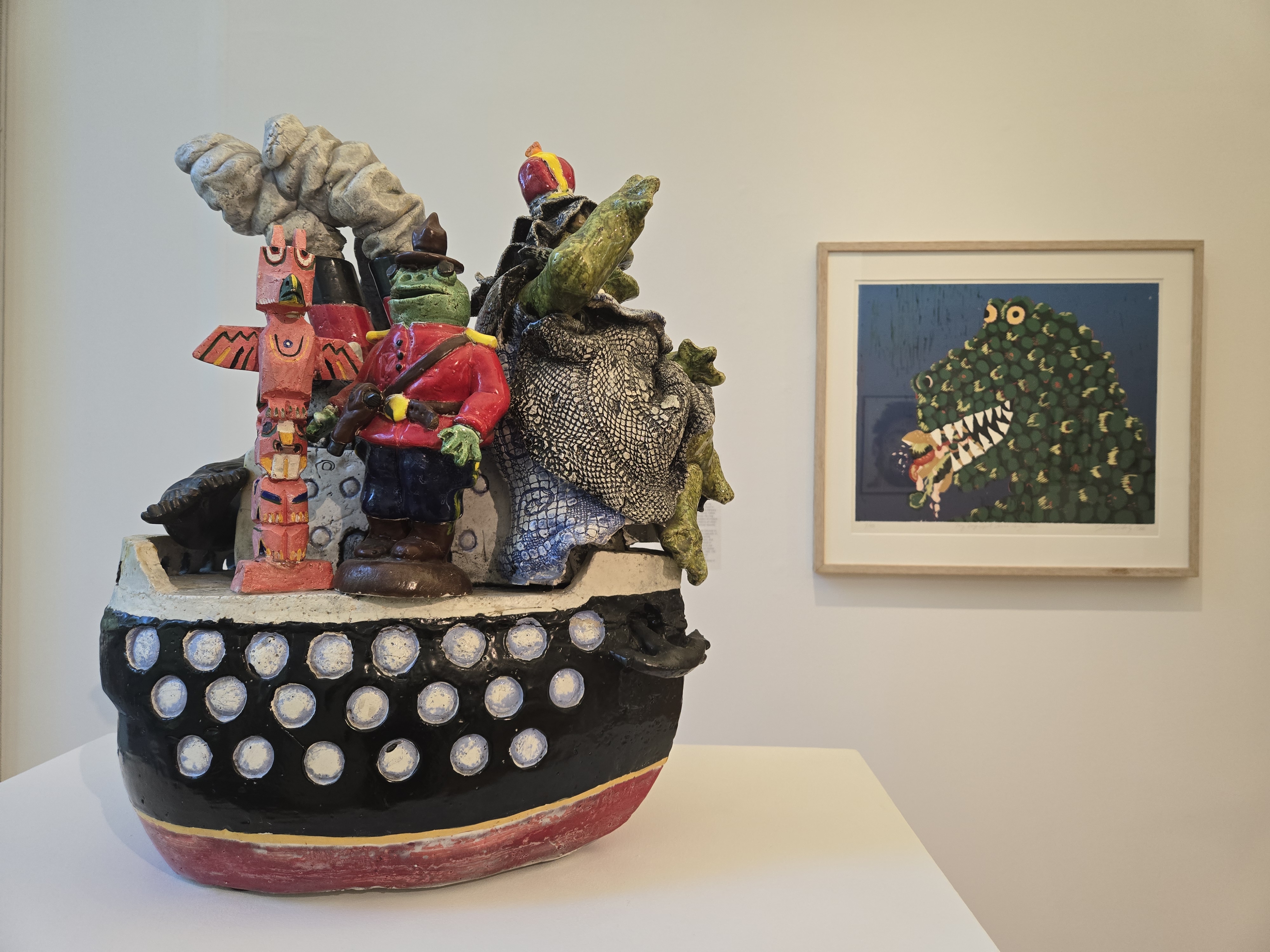 The often-underrated domain of innovative ceramic sculpture has its due spotlight here, courtesy of celebrated Bay Area artists Peter Voulkos and Don Reitz, working with new techniques and aims beyond conventional ceramic traditions. Elsewhere, ceramics are put to fruitful creative use by David Gilhooly, part of the Funk Ceramic movement in San Francisco, whose woodcut “My Dog Spot Loves Big Macs” and animalistic pile up sculpture “Old Vic” feature cartoony characters and wryly misleading titles. Artist Akio Takamori’s ceramic figure in lotus position, on the floor, speaks to his Japanese-illustration-evoking, Adam-and-Eve-esque lithograph “Fruit Tree.”