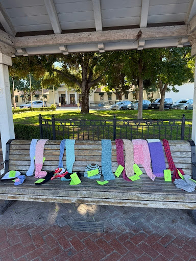 The season of giving is alive in Goleta, where hand-knit scarves, hats, and gloves are popping up at bus stops and public spaces — each tagged with a simple message: “Take me if you need me or like me. Happy Holidays.”