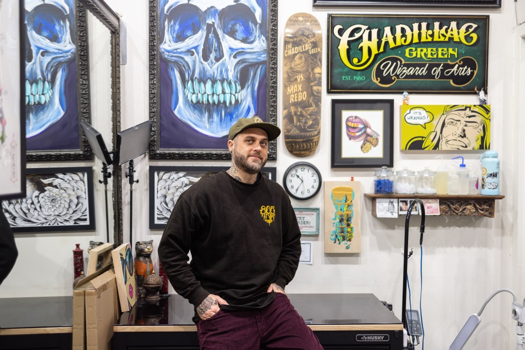 Asked about all the creative facets of his life, Chadillac says they are all separate. “But they balance me,” he says. “Canvas painting, murals, tattoos, deejaying, and family life … they are different alleyways to me. I’m thankful that I am able to be an artist.”