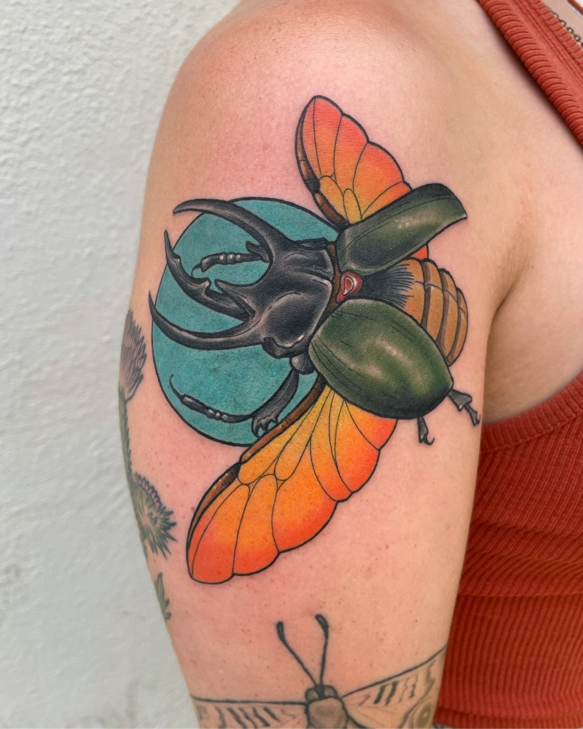 Green began tattooing at age 25, trained by Jeremy Latta. At first, he thought it would be great to be doing tattoos and not have a tattoo on his own body. Then he realized that he wanted to see what it was like for himself. “I thought it was cool!” he says. “I got a skull with guns. It was a great feeling.”