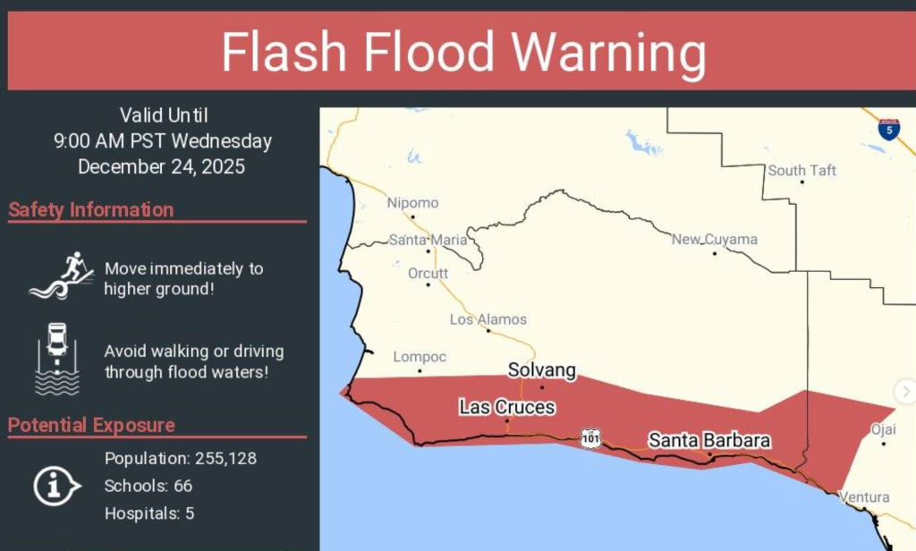 On the night before Christmas Eve, heavy rains pelted Santa Barbara County, with rain meters from Santa Maria to Carpinteria reporting between 2–5 inches of rain overnight. Early morning risers were greeted by windswept showers spraying the sides of windows and houses, and by 6 a.m. a Flash Flood Warning was issued for the entire Southern Santa Barbara County, effective on Christmas Eve from 9 a.m. to noon.