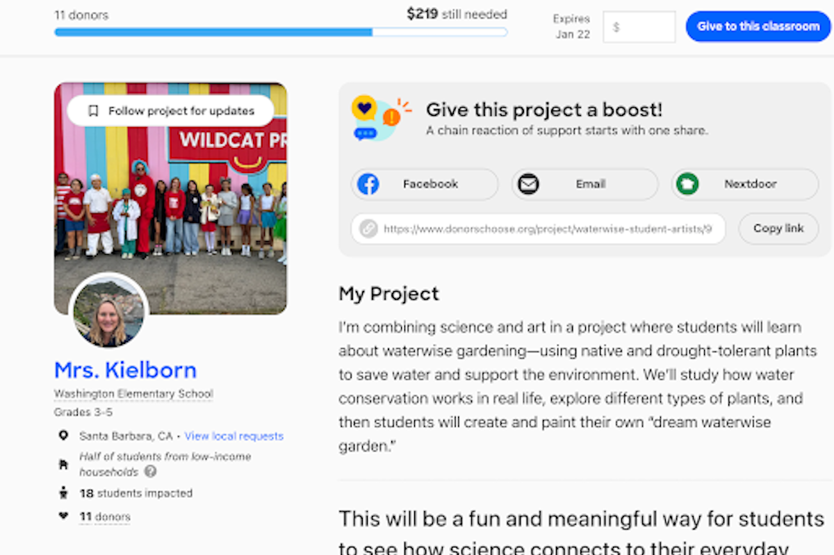 “It’s such a hard time of the year, and it is awkward asking people for money, no matter what it is,” Kielborn said. She’s raised a majority of the funds for a new science project for her students, amid multiple other teachers’ campaigns. She’s about $200 shy of the project’s goal, aiming to meet it by January 22. Community members can see Santa Barbara’s teacher profiles on DonorsChoose.org.