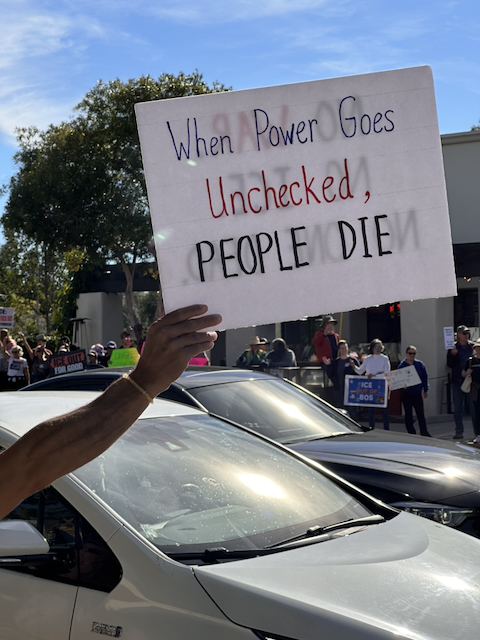 And so, in our little red car, we drove over the pass into Santa Barbara and joined about two thousand fellow protesters along north State Street. Signs were blunt: “ICE Domestic Terrorists”; “Same Shit. Different Hat”; “Our Care Is Greater Than Your Scare”; “When Power Goes Unchecked, People Die”; “Believe your eyes, not ICE lies”.