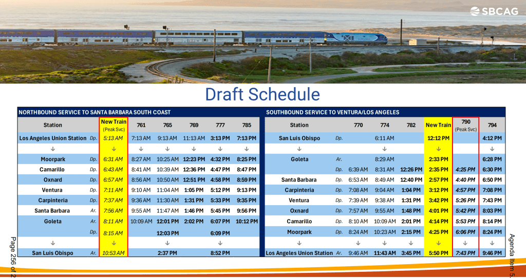 The current proposal is a northbound train that would leave L.A. Union Station at 5:13 a.m. and stop at Santa Barbara at 8:11 a.m.; the southbound train would depart San Luis Obispo at 12:12 p.m., going through Goleta at 2:33 p.m. and Santa Barbara at 2:57 p.m. Each train would make the usual stops at smaller stations such as Guadalupe, Bonfilio said.