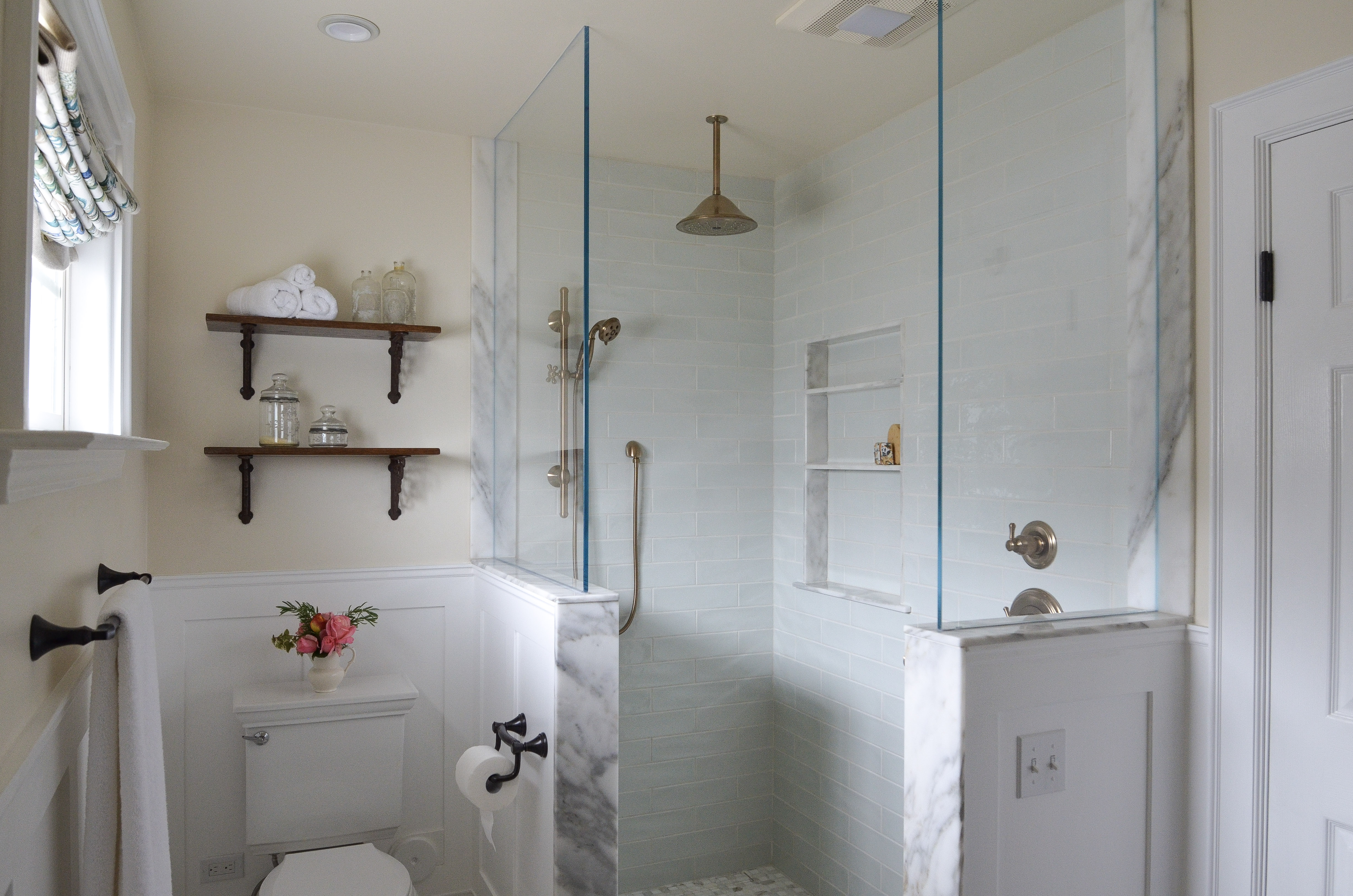 If your budget allows for reconfiguring the layout, this is where you’ll get the greatest return. Adjustments such as widening a shower, relocating a toilet, and improving door swing can dramatically change how the space feels. In this case, we were able to leave everything exactly where it was. We swapped out the existing tub and shower combo to install this stunning walk-in enclosure, complete with marble and glass details. This created an open and airy feeling in this relatively small layout, allowing us to maximize the feeling space and serenity.