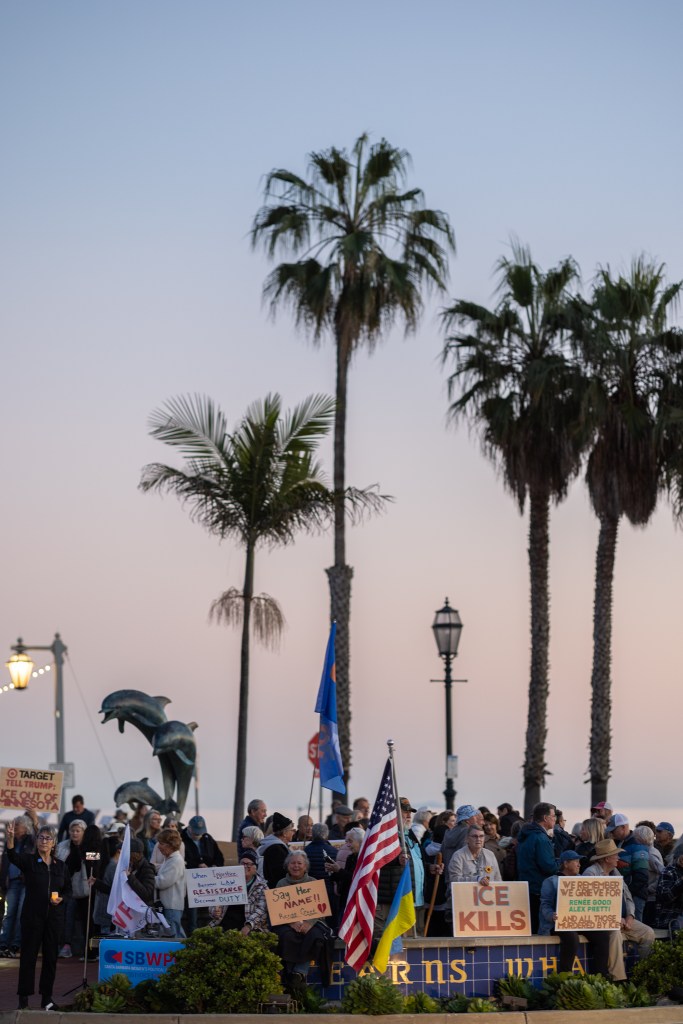 At Monday’s candlelight vigil along Cabrillo Boulevard, I walked the line of people standing shoulder to shoulder with candles and signs, covering the vigil for the Santa Barbara Independent. The line stretched for about two blocks in each direction from the Dolphin Fountain at Stearns Wharf. I walked it back and forth. I talked to families, to seniors, to young couples. I spoke with Ellen DeGeneres, who stood quietly holding a candle on her birthday because, as she told me, “This matters.”