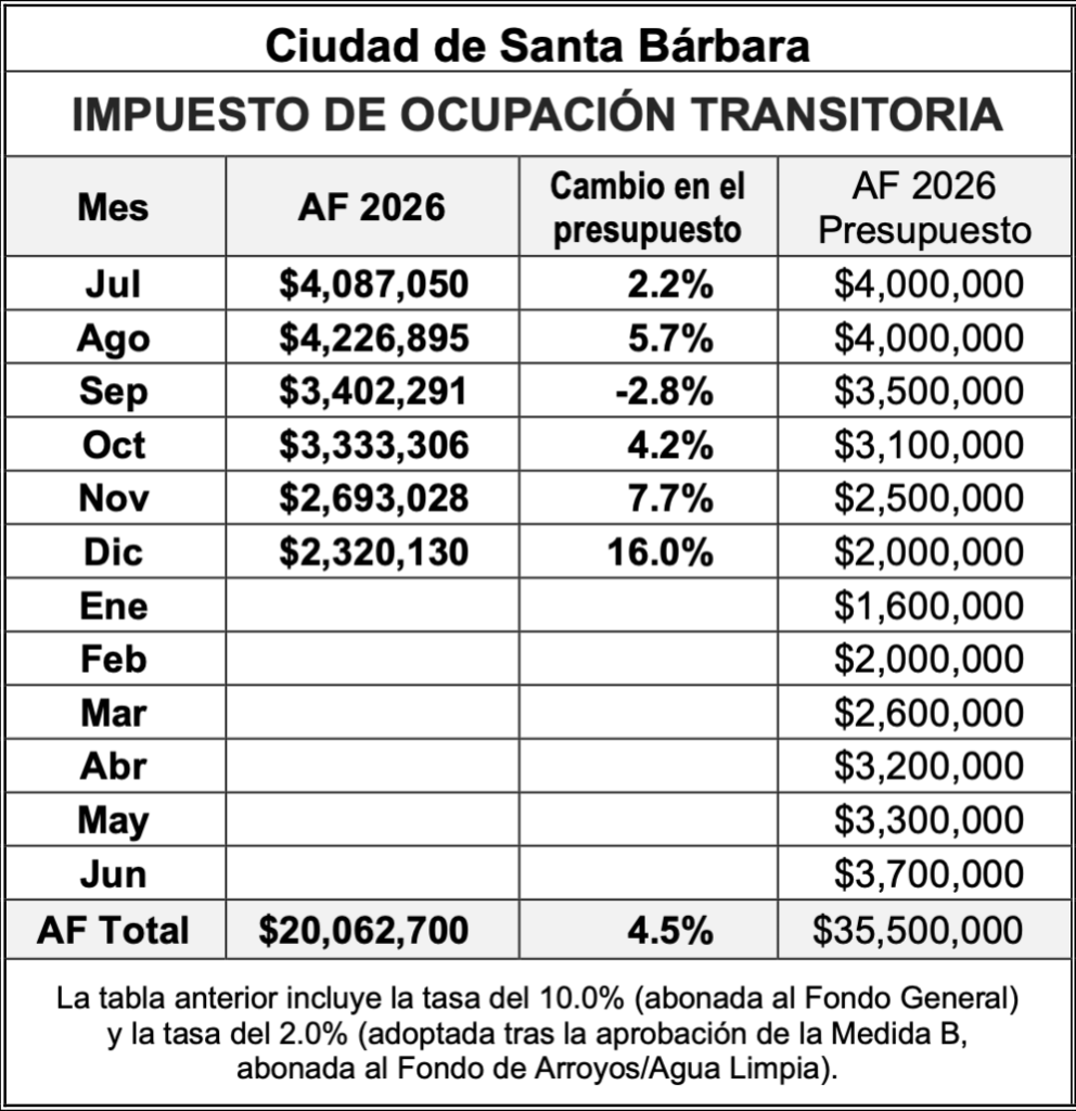 La Ciudad de Santa Bárbara recaudó $2.3 millones en Impuestos de Ocupación Transitoria (TOT) en diciembre de 2025, el sexto mes del año fiscal de la Ciudad.