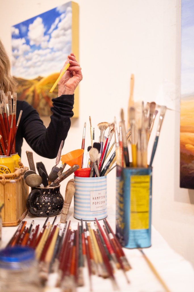 Brunner and Buster led me to her paint studio — a high-ceilinged room with plenty of light. It looks like a gallery space with its white walls — and all of the paintings that are going into her exhibit at Sullivan Goss are on display.