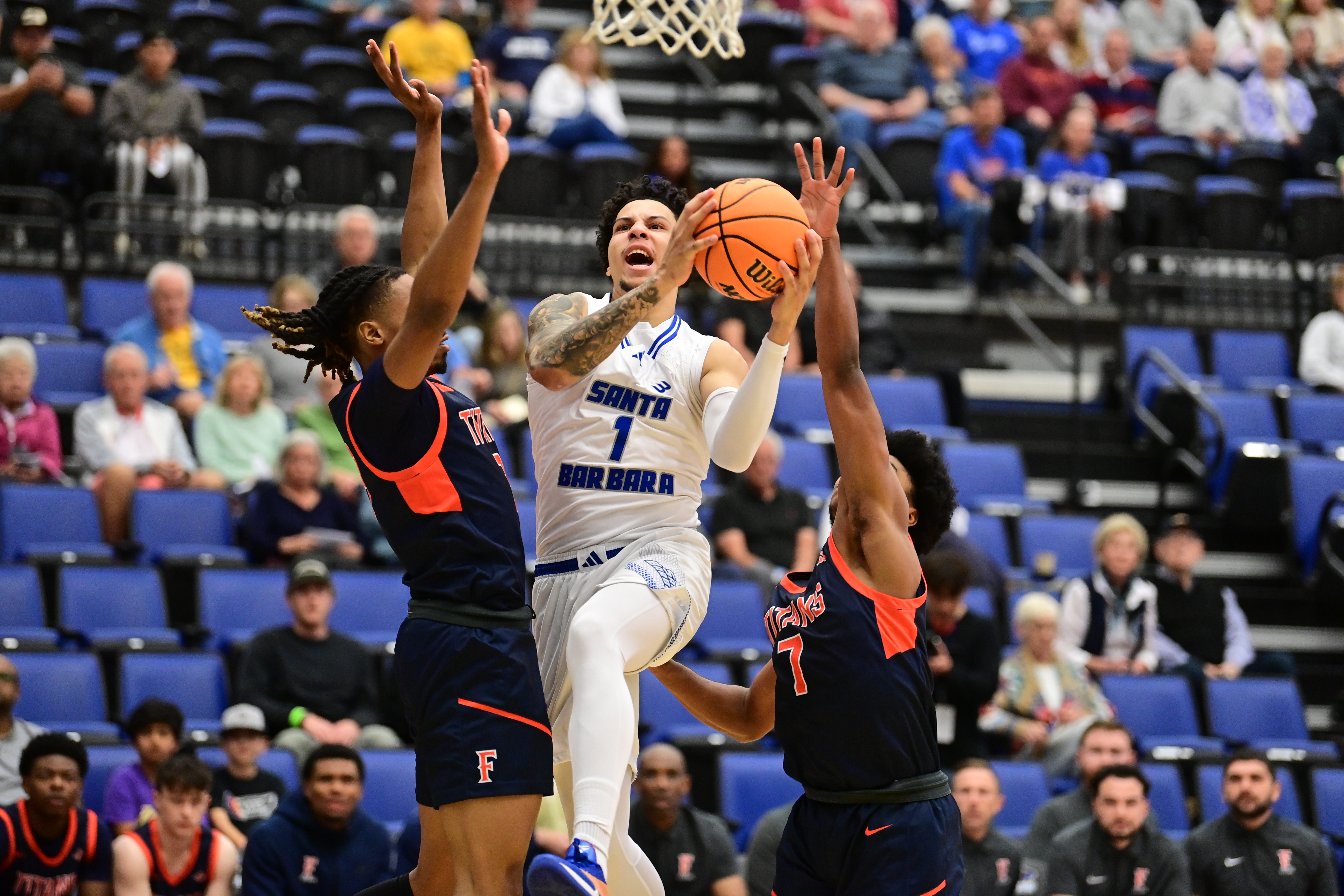 The Gauchos’ first-half lead ballooned to 34–16 on a three-point play by Miro Little with 3:20 remaining in the half, but Cal State Fullerton closed the half on a 13-4 run, capped off by a KJ Garris layup at the buzzer that cut the deficit to 38–29.