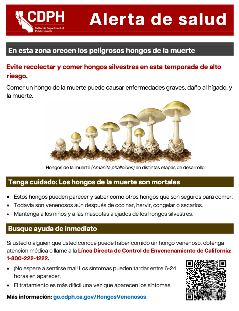 Para obtener más información, visite la página de hongos silvestres venenosos del CDPH en https://www.cdph.ca.gov/Programs/CCDPHP/DEODC/EHIB/Pages/EIS/Poisonous-Mushrooms-SPAN.aspx.