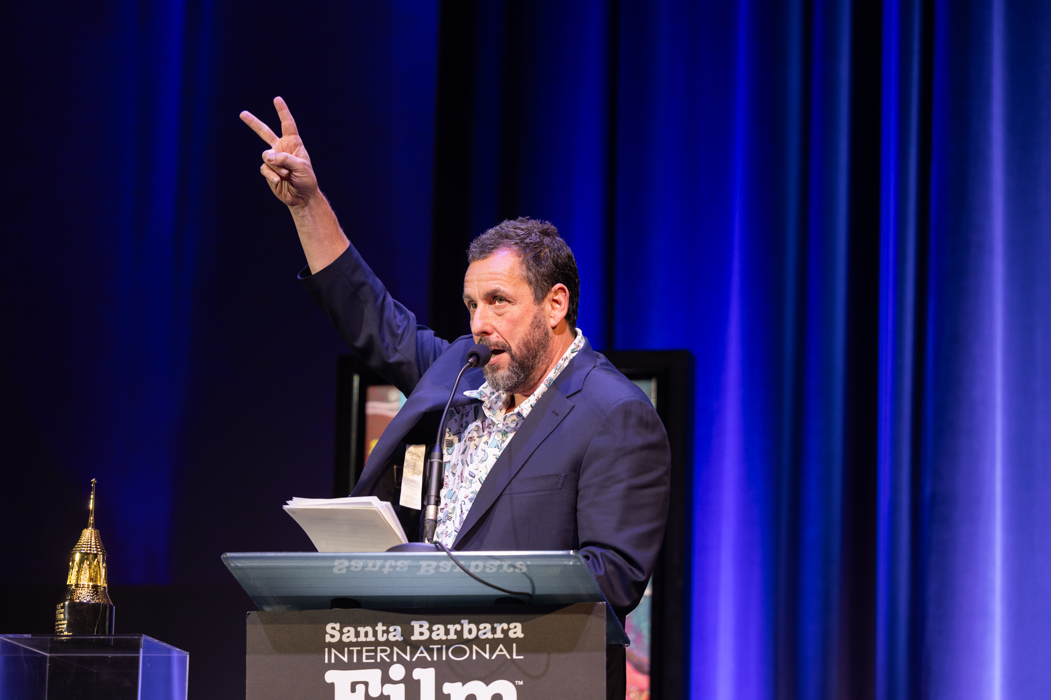 Adam Sandler accepts his award at the Maltin Modern Master Award ceremony during the 41st Santa Barbara International Film Festival at The Arlington Theatre on February 05, 2026 | Photo: Ingrid Bostrom