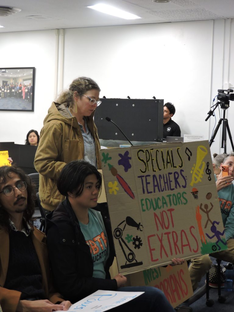 One parent, Janet Munoz Emery, came to the meeting with her daughter, who had her oboe in her hands. “Music was not just an elective. It was my refuge,” she said.