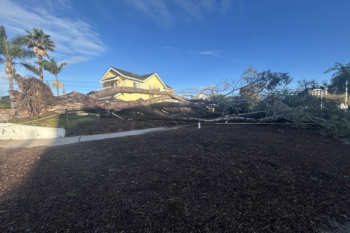 On Wednesday morning, remnants of the storm were apparent on roads and in yards. The City of Santa Barbara’s police department sent a notification asking people to avoid the 400 block of Garden Street due to extensive downed debris from the stormy night previous — debris that included scaffolding from the nearby housing project at 425 Garden Street, according to KEYT News. KEYT also reports a snapped power pole at Flora Vista on the Mesa, with power lines lying in back yards. And in Isla Vista, wind uprooted a tree at the end of Del Playa Drive. The tree, approximately 30 feet tall, missed a house by a few yards.