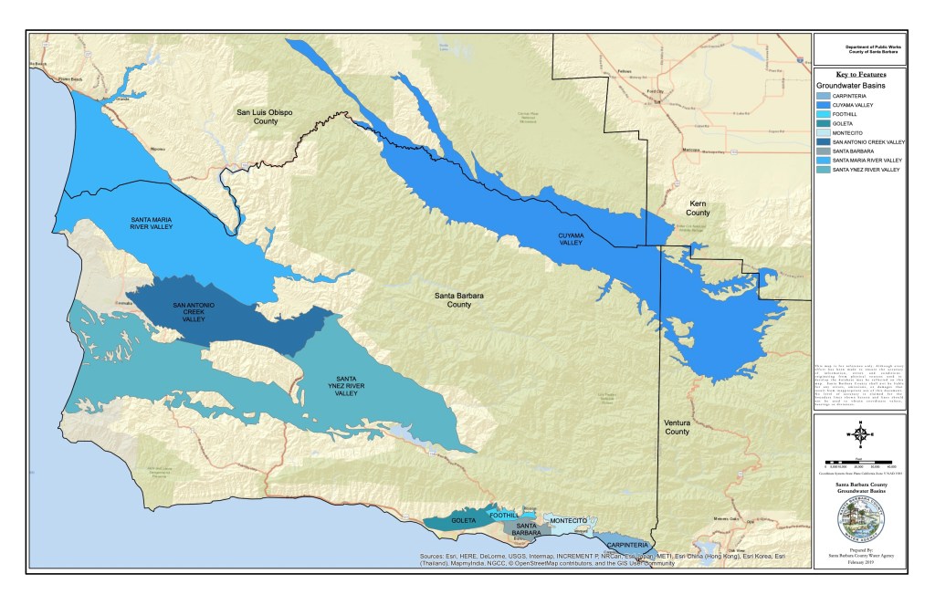 [Click to zoom] The state’s Department of Water Resources and the Santa Barbara County Water Agency keep tabs on wells that monitor groundwater levels as they rise and recede in about nine major basins around the county, including these five South Coast basins. | Source: Santa Barbara County 2025 Groundwater Basins Summary Report