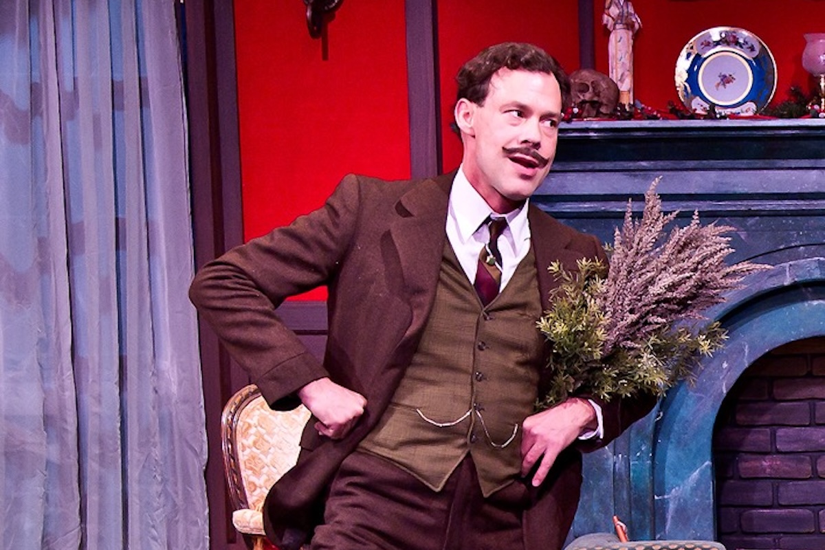 Directed by Jenny Sullivan, Rubicon’s production is set in the round. The cast creates a play within a play by making themselves known as actors before launching into the story. The playing area, ringed by deco-style footlights, is reminiscent of an antiquated performance space in the realm of early-twentieth-century stage or circus tent. This intimate setting demands not only tack-sharp physical comedy, but a stylized dance of blocking that shows each scene from every angle. The show utilizes the entire theatre space, with the actors (playing more than 100 characters with the change of a hat or costume piece) dashing and creeping throughout the house.