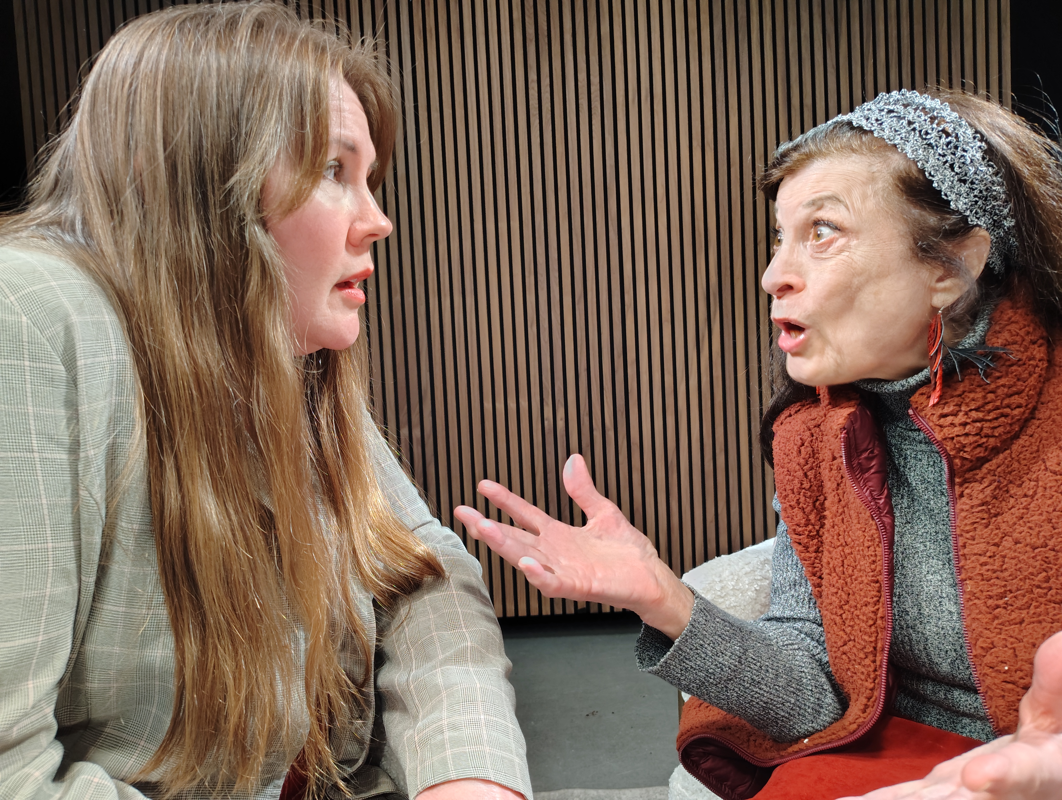 Set in the mid-1970s, Chinwag (also the name of the play’s talk show) features Matthew Tavianini as host (and small-town celebrity) Russ O’Sullivan. He’s a quirky personality with shades of the era’s inevitable polyester lechery that was too easily passed off as humor. O’Sullivan begins his broadcast by introducing his guests: an older woman named Dorothy (Meredith McMinn) and her passionate (if naïve) twentysomething protégé (Alaina Dean). Ostensibly there to spread the good word of feminism, the two hold O’Sullivan hostage with the promise that the contents of Dorothy’s purse are explosive.