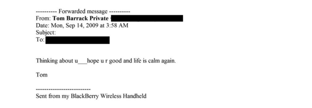In September 2009, just two months after Epstein’s release from jail following his conviction for soliciting a minor, Barrack wrote to him: “Thinking about u___hope u r good and life is calm again.” In January 2012, Barrack complimented Epstein on his work ethic, asking him, “How is my role model?”