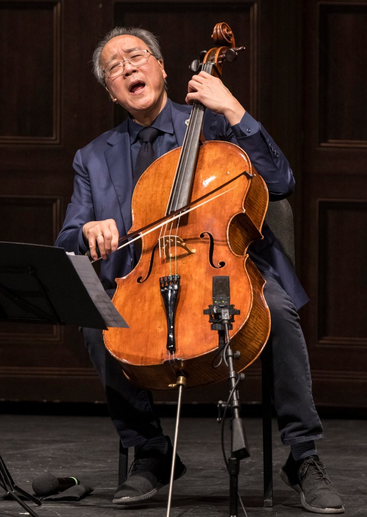 After the Harold Arlen classic, by way of a personal and attitudinal introduction to the concert, Ma addressed the audience, first quoting the song: “‘If a bluebird can fly, why can’t I?’ This was a song of hope in 1938. I’m full of hope … because of that, we’re going to try this experiment, with three new pieces. I am an immigrant, and the great immigrant is music. It travels, and it belongs to us wherever we go.”