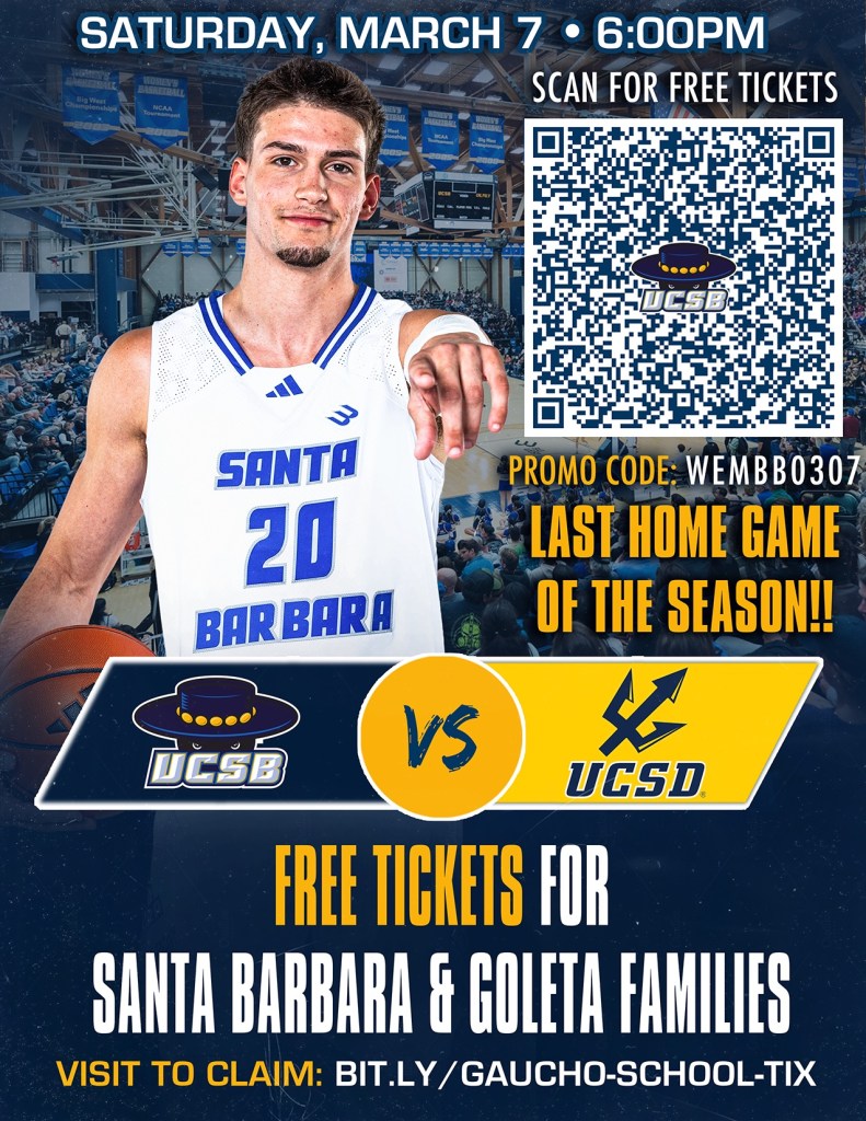 The UC Santa Barbara Gauchos men’s basketball will close out their home schedule Saturday evening with a matchup against the UC San Diego Tritons on Saturday, March 7 beginning at 6p.m.