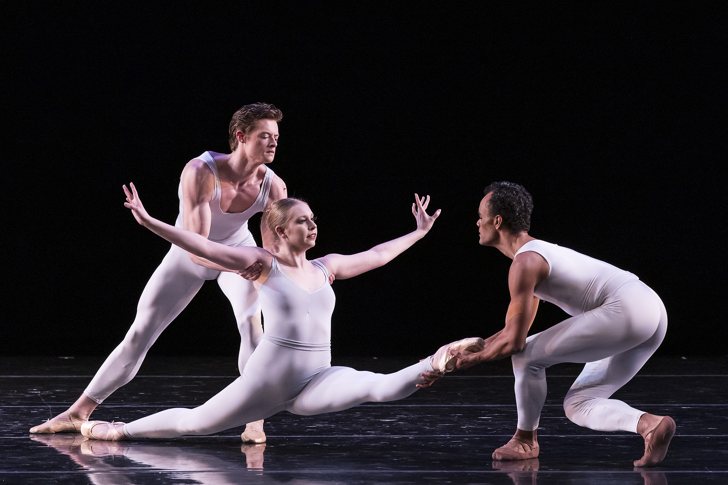Wednesday night’s program began with Rondo, a classical duet danced by Mira Nadon and Indiana Woodward, principal dancers with NYCB, set to Mozart’s Rondo in A Minor, and played by pianist Elaine Chelton, of the NYCB Orchestra. Concertino, a trio with a more modern flare, danced by Taylor Stanley (principal), Jules Mabie, and Dominika Afanesenkov (soloists) with NYCB, followed. The Stravinsky music was played by the String Quartet of the Santa Barbara Symphony, with a clarinet solo by Daniel Mui of the NYCB Orchestra.