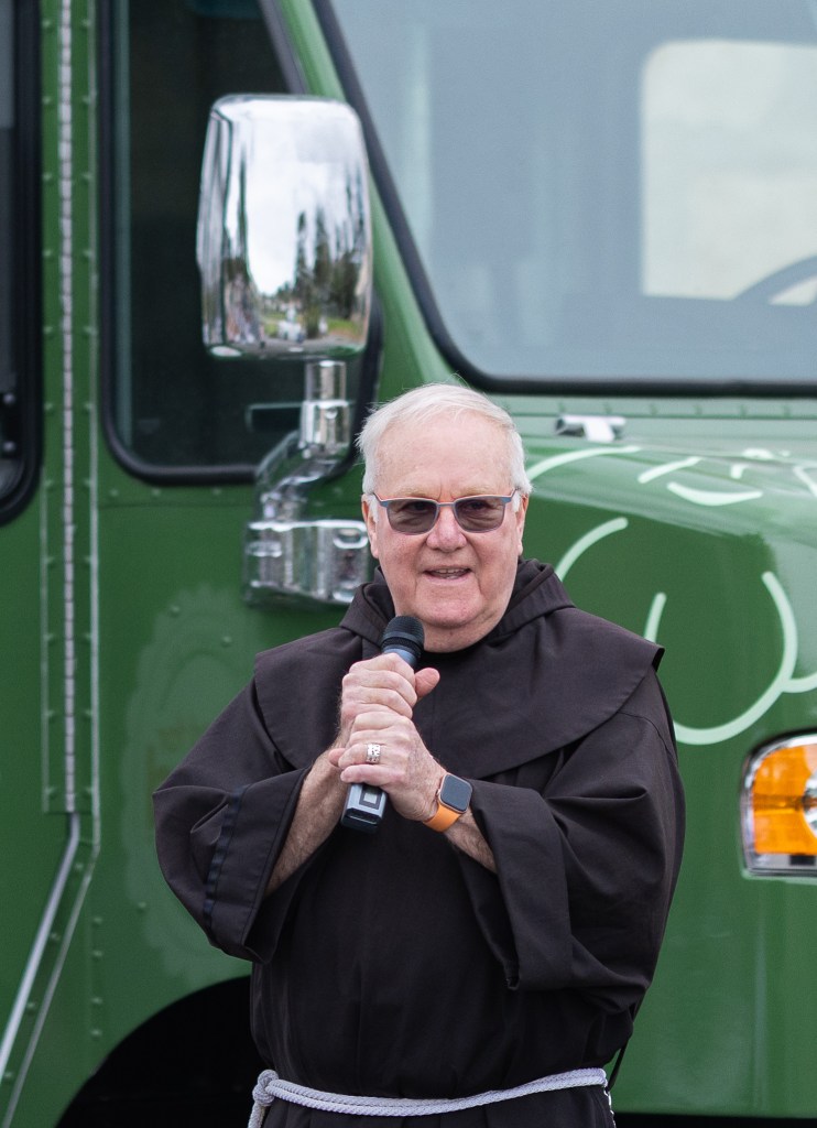 This Tuesday, Barnard and a large group of assorted well-wishers and co-conspirators gathered at the steps of the Santa Barbara Mission under a gloomy noonday sky. Greeting them was the irrepressibly joyful Father Larry Gosselin, wearing the traditional Franciscan brown cassock, who blessed the brand new, green and white, 18-foot-long food truck with an electrically powered industrial-scale kitchen.