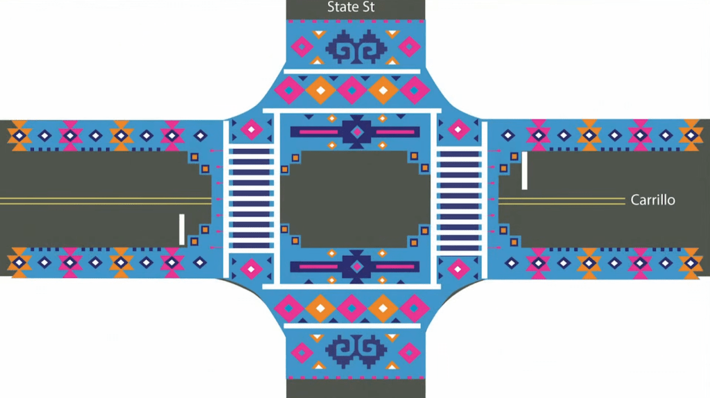 The City of Santa Barbara released the design for an upcoming public street art project, which will transform the corner of State and Carrillo streets into a vibrant display inspired by Mixtec and Zapotec weaving patterns. The project is part of Bloomberg’s Asphalt Art Initiative, which selected the city as one of 10 cities in North America to receive a $100,000 grant for a public street art project last year.