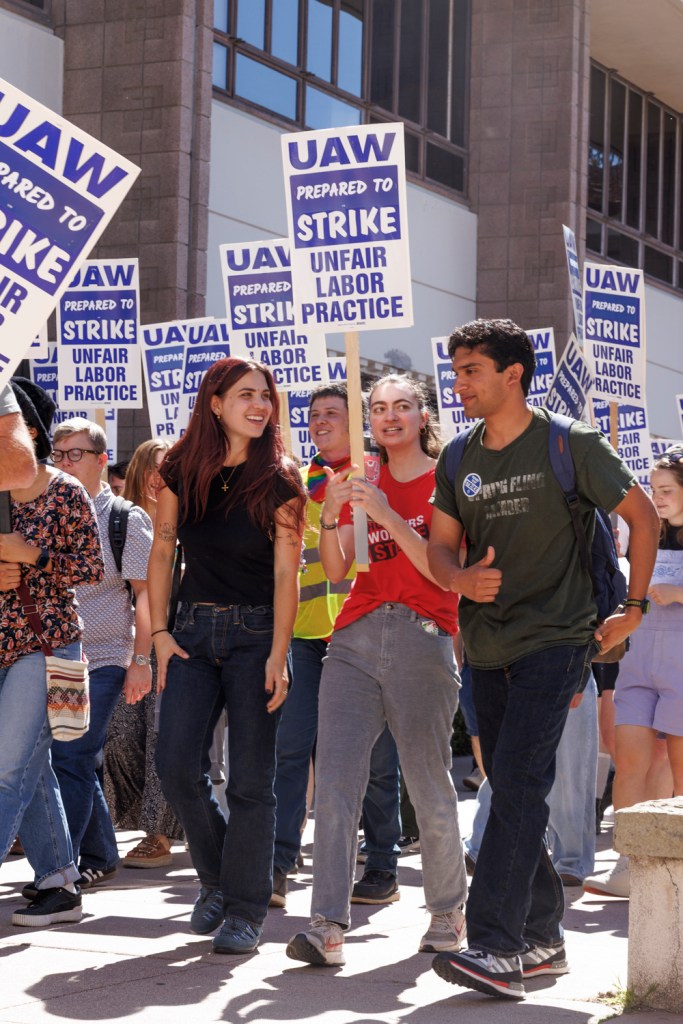 Roughly 300 workers marched through the center of campus shortly after noon, carrying signs and chanting for fair pay, job security, and protections for international employees. Similar demonstrations were held concurrently across all 10 UC campuses as part of a coordinated action by United Auto Workers Local 4811, which represents tens of thousands of academic and professional staff systemwide.