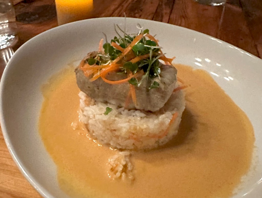 The family vibe, though, is key — especially since Kopley has been the head chef for some time now. Henry stressed how much her presence in the kitchen helped them keep singular control of the vision. You see that in something seemingly as “simple” as a perfectly cooked filet of Channel Island line-caught fish — it was rockfish at our dinner — atop a column of jasmine rice in a shallow pool of bright and rich coconut lemongrass curry sauce. Or a vegetarian cassoulet with Jalama Ranch chanterelle, Lompoc butter beans, kale, shallot, and more of that Finley Farms carrot. There was so much developed flavor that no one could miss the meat.