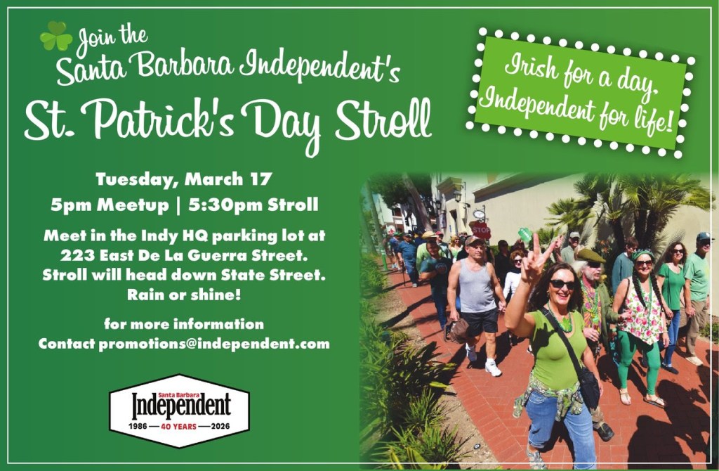 Calling all readers, neighbors, friends, fans, and family: The almost-famous Santa Barbara Indy St. Patrick’s Day Stroll is back! Join us on Tuesday evening as we don our green, meet at our brand new office location – 223 East De la Guerra Street – and stroll down State Street. We’ll be accompanied by real live bagpipes, and will end our stroll at Institution Ale, 516 State Street. All ages are welcome for this family friendly frolic. As we like to say: Irish for a day, Independent for life!