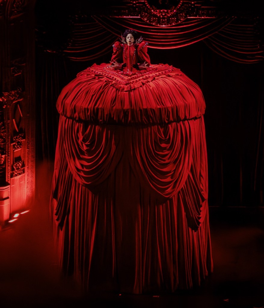 At the start of the Mayhem Ball show, celebrating her aforementioned record, Gaga emerged from the back curtain on top of a gigantic, two-story high red dress, looking like a groom on top of a wedding cake. She started singing “Bloody Mary,” and after the first few lines, her dress opened up to reveal a dozen dancers locked behind the metal bars of her skirt. Gaga then broke into recent hit “Abracadabra,” then “Judas,” finally reaching the ground for “Aura.”