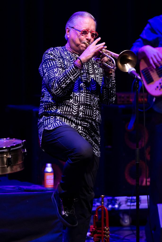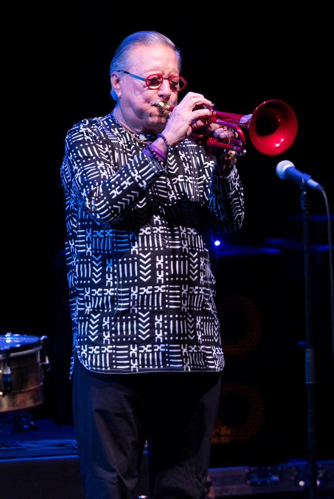 The Gillespie influence was detectable in Sandoval’s show here, beyond just a brisk medley of bebop tunes in the middle of the set. Sandoval, now 76 and going strong, has an almost too easy and natural virtuosity, which extends from trumpet and flugelhorn (a red model) to keyboards and timbales. His playing can be impressive on its own terms, but we don’t often get a sense of him exploring or going outside his showy comfort zone.