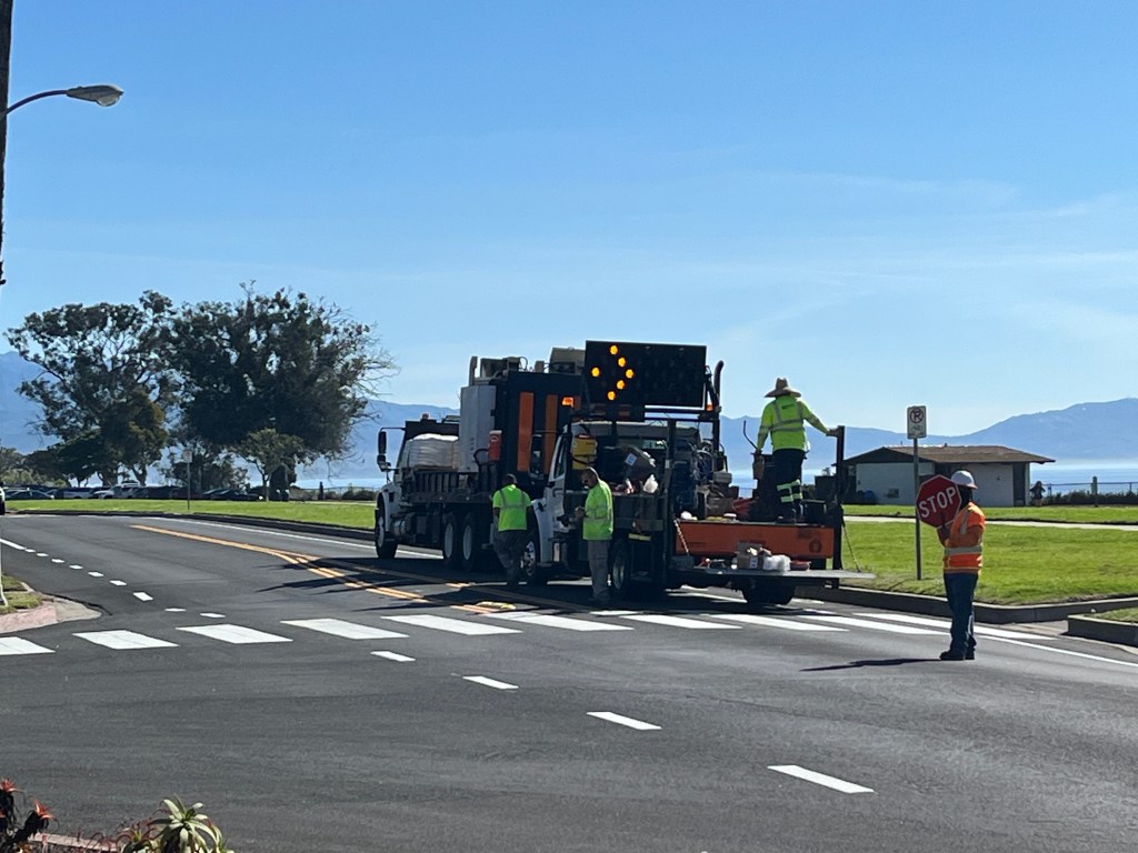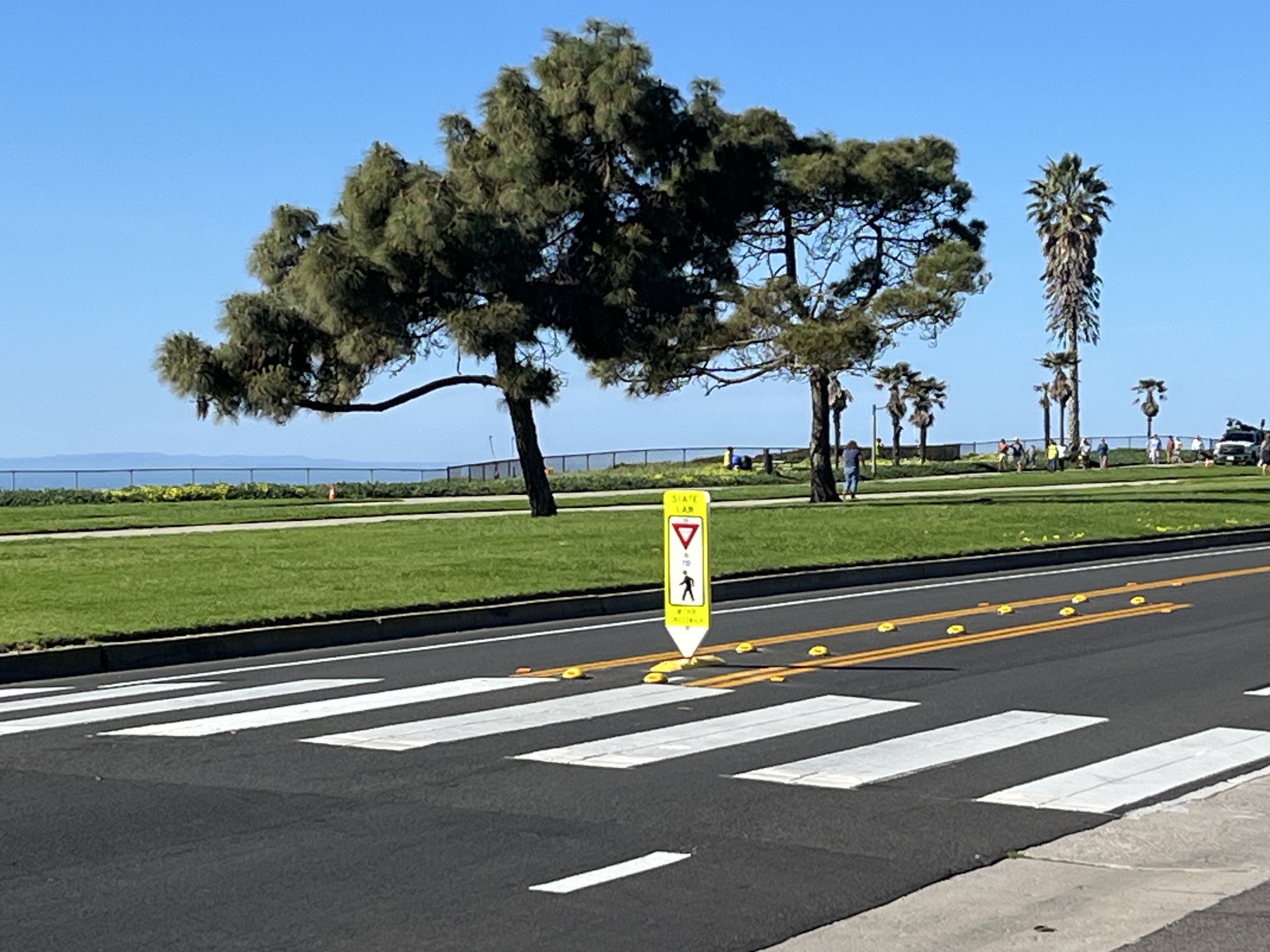 The crosswalk signs finally got installed this morning! The official name is crosswalk pedestrian stanchions lane, aka, squisher striping with the pedestal crosswalk sign in the middle of the street. I requested that they be installed on Shoreline and San Nicolas, Santa Rosa, La Plata, and San Clemente.