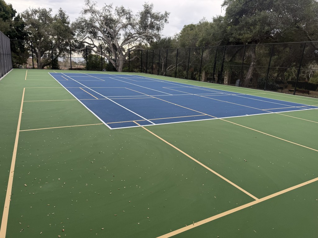 The County of Santa Barbara, Community Services Department, Parks Division, recently completed construction to restore the public tennis court at Manning Park in Montecito. Improvements include replacement of the tennis court and additional court striping for four pickleball courts. The project was constructed with a steel-cable post-tensioned concrete foundation to assuage cracking and pile footings to protect two mature oak trees. Colored acrylic court surfacing was applied in accordance with American Tennis Association (ATA) standards.