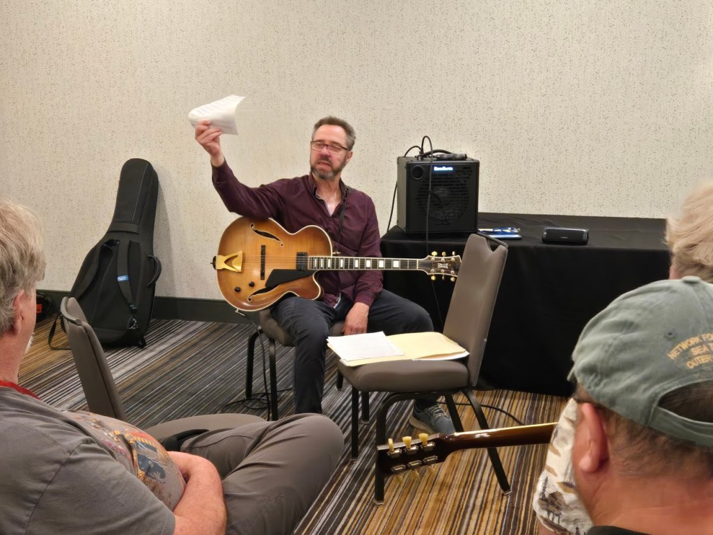 I stopped by and wandered over from a loose but steamy meet-up in the jam session room, including Santa Barbaran guitarist Craig Sharmat in flight, and then checked out a class underway by the title “Tri-Tone Explosion,” led by veteran teacher-player Adam Levine. In another corner of the festival spread, a duet performance found Brad Rabuchin and David Becker offering their improvisational ideas on the timeless theme of “All the Things You Are.” Becker then played a solo set, with looping and tastefully deployed effects in the mix — an anomaly in this mostly clean-toned mainstream jazz confabulation.