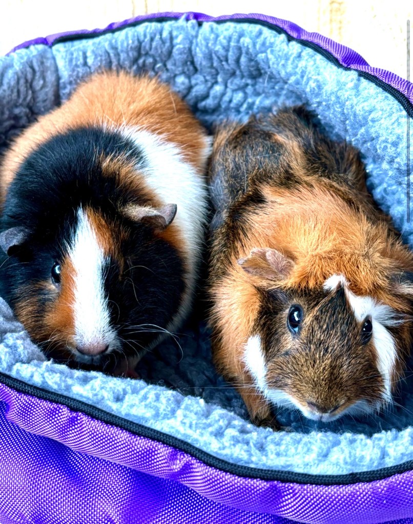 These two cuties are young sisters and they are both as sweet as two piggies could be. They have beautifully colorful coats of black, white, and red plus some lovely brindle in the mix. Daisy has the abyssinian breed swirls while Oopsy is mostly smooth-coated. This pair would be perfect for first-time guinea-pig adopters or great for the very piggie-experienced as well!