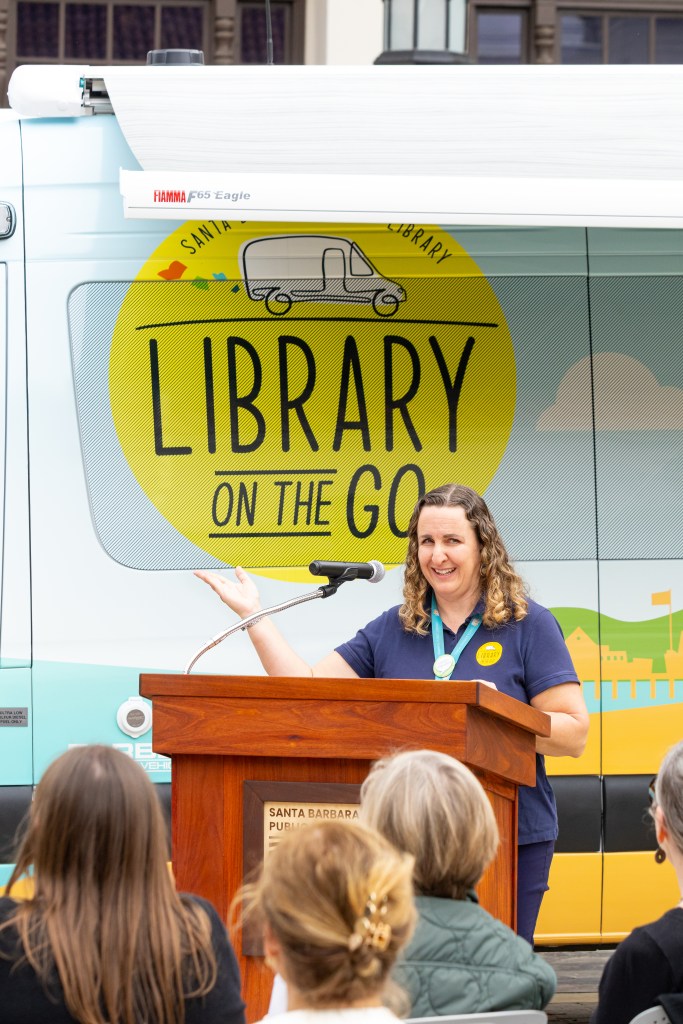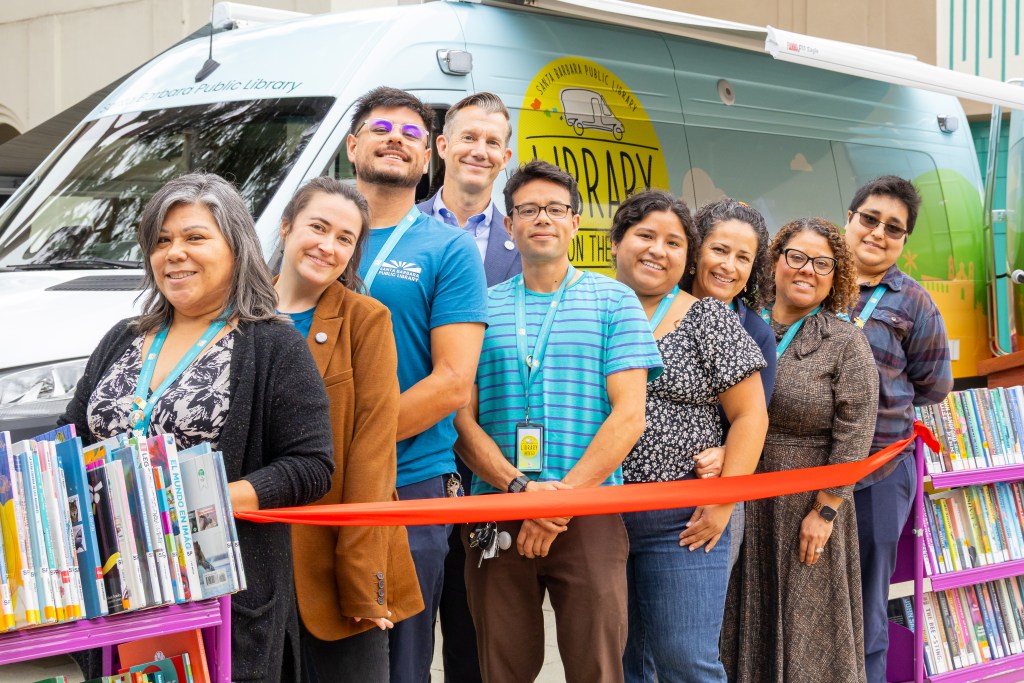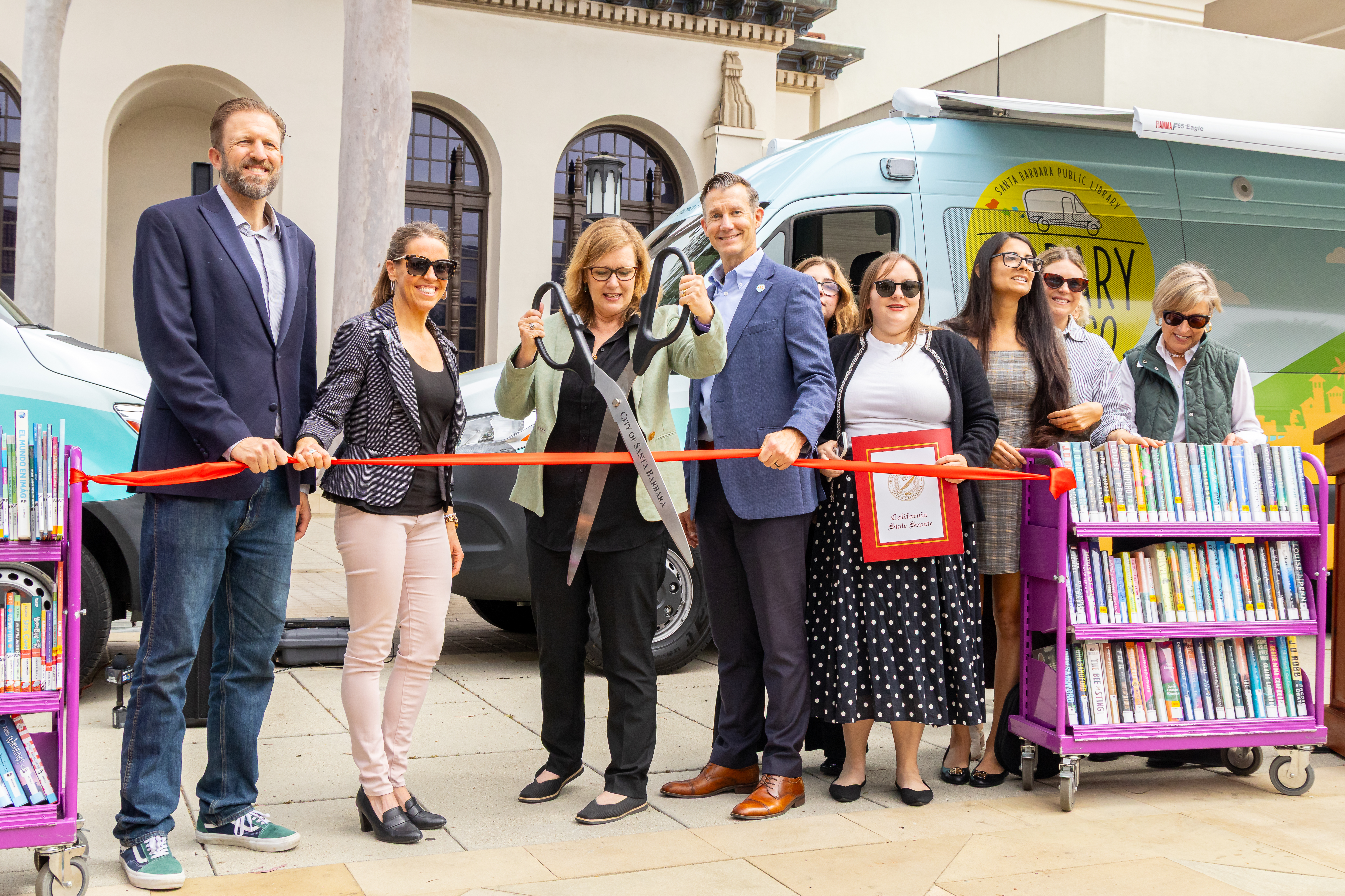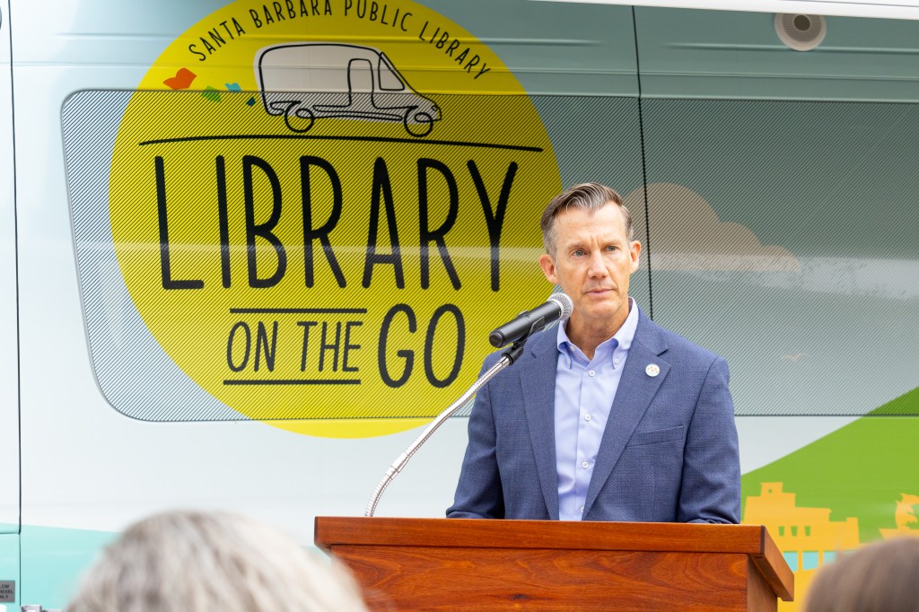 Public officials, library staff, support groups, and community members gathered in Library Plaza on Wednesday to celebrate the new Library on the Go van, the second in the Santa Barbara Public Library’s mobile “fleet” of vehicles designed as what Library Director Brandon Beaudette described as “our mobile outreach operation that meets patrons where they are by bringing library services directly onto our streets.”