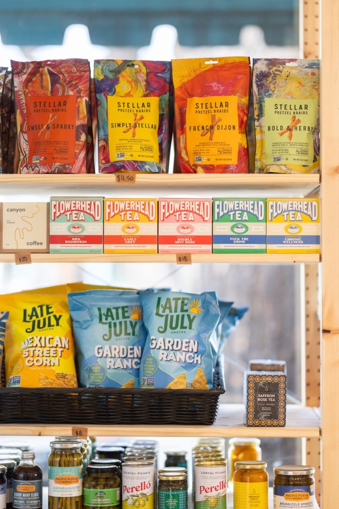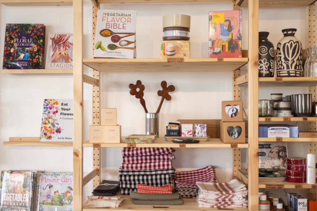 “Everything” at Flower Girl includes produce and pantry items, cookbooks and vegetable seeds, craft candy and incense packs, paper towels and handknit napkins, Hot Wheels and cat clocks. “We have fancy rice and regular rice, fancy pasta and regular pasta,” she said. “The thought is to be a grocery store for the neighborhood.”