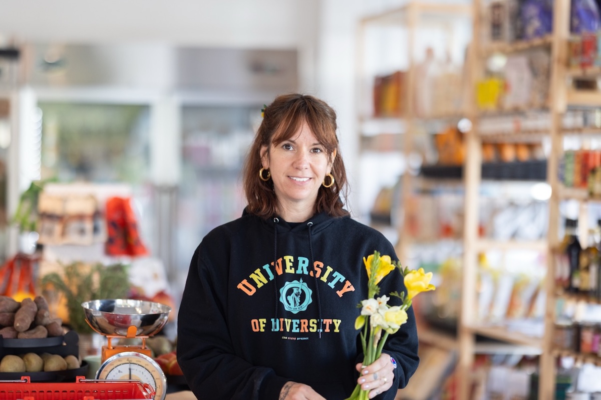 “Everything” at Flower Girl includes produce and pantry items, cookbooks and vegetable seeds, craft candy and incense packs, paper towels and handknit napkins, Hot Wheels and cat clocks. “We have fancy rice and regular rice, fancy pasta and regular pasta,” she said. “The thought is to be a grocery store for the neighborhood.”