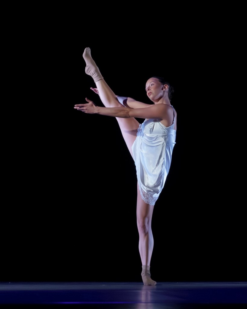 The momentum shifted with the pieces, “The Rate at Which I Am,” followed by “Focus,” both choreographed by Joshua Manculich. In the former piece, with shifting lighting spotlighting one or more of the six dancers on stage at a time, a focus on human connection was clear. “Focus” slowed the energy with two dancers on stage wearing white satin dresses, where one dancer watched almost with the audience as the other danced deliberately with gravity-defying bends and stretches accompanied by a crescendo of strings.