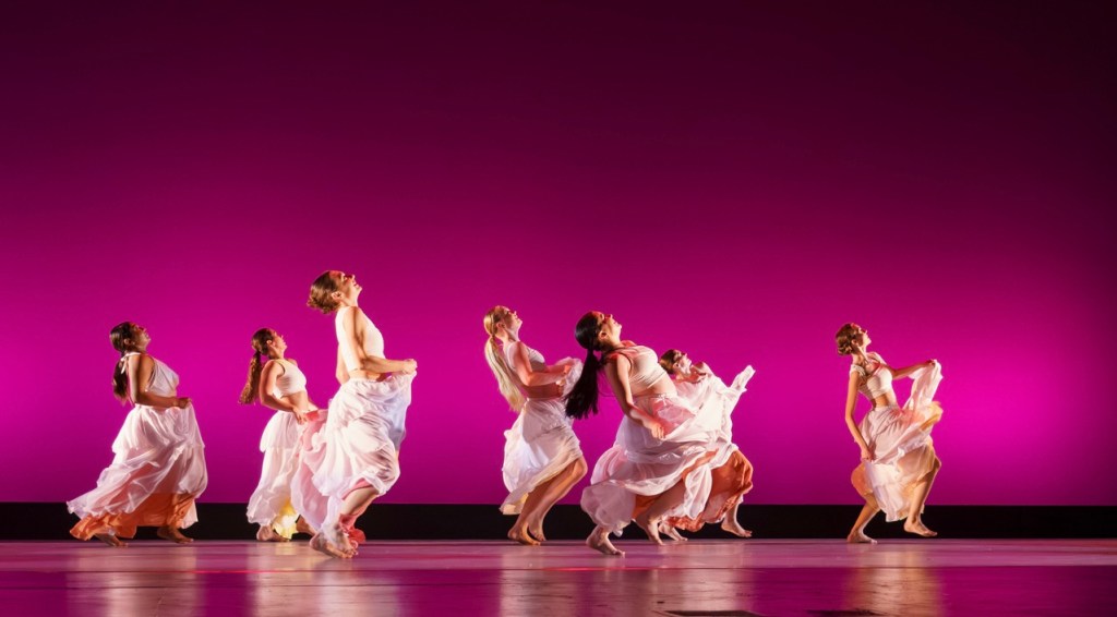 Shifting gears, in “We Were Light,” choreographed by Annalise Evans, were seven performers in flowy skirts danced with golden lighting, eliciting feelings of childhood playfulness. The initially gentle music and lighting transitioned to adulthood with bright reds and hot pinks before again returning to the soft warm lighting and flowy, free-spirited movements.