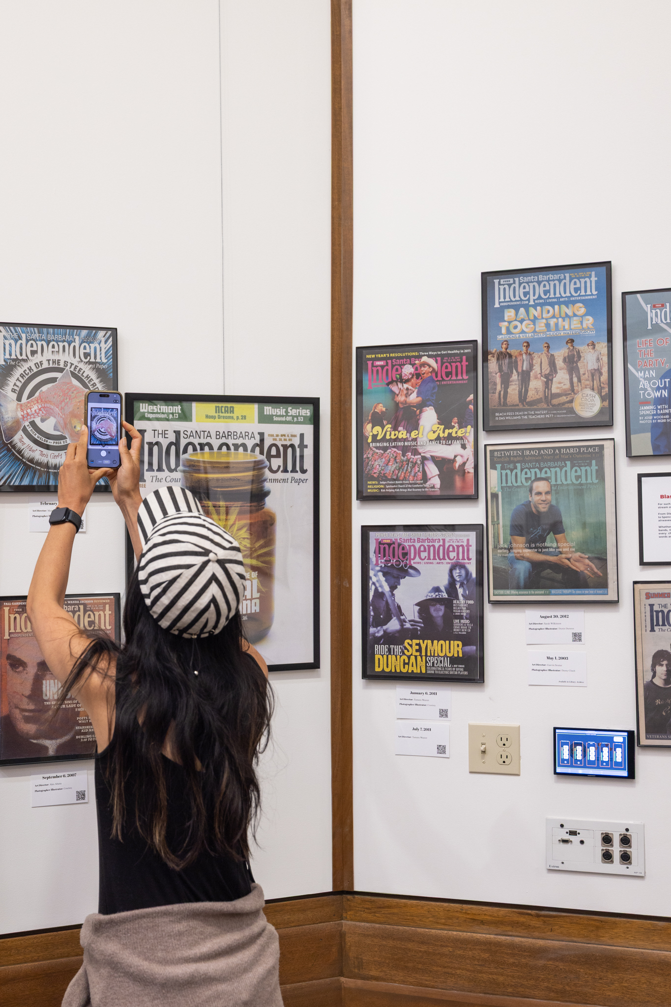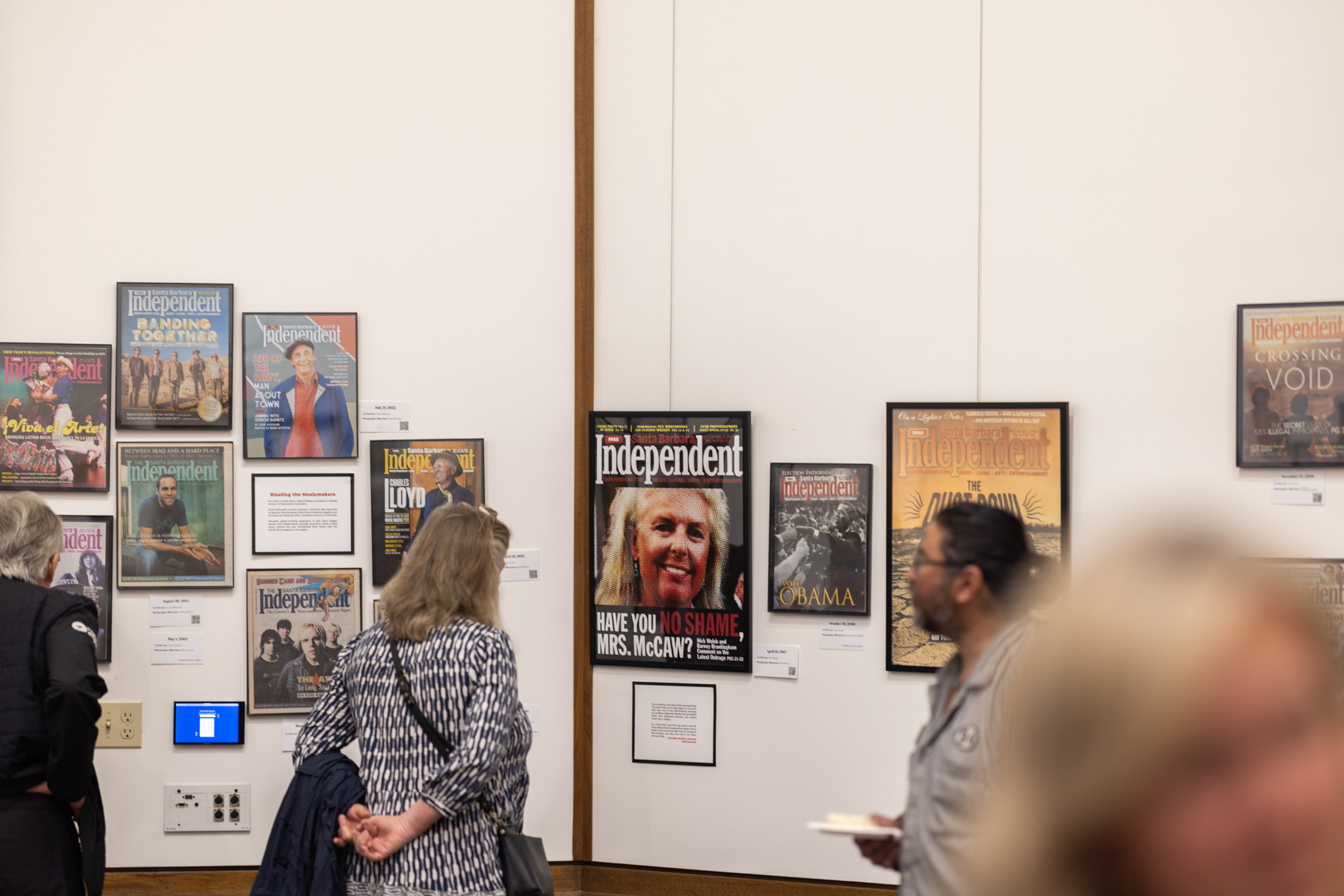 Countless hours of work went into curating this show. Marketing and Promotions Administrator Richelle Boyd spent many of those hours with Partridge and Rivera poring over the more than 2,000 editions of the paper that have been published since 1986. Using a textbook scanner at Santa Barbara City College, Boyd and Business Operations and Accounting Manager Erin Lynch painstakingly digitized the 150 covers that were selected for display. Every cover from 2006 or later has a QR code guests can scan to read the cover story from that issue.