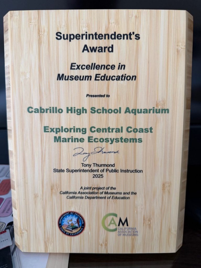 LOMPOC, CA — The Cabrillo High School Aquarium has been recognized with the Superintendent’s Award for Excellence in Museum Education by the California Association of Museums (CAM), the state’s most prestigious honor in museum-based education. The award was formally presented at the CAM Annual Conference, where a video congratulations from State Superintendent Tony Thurmond was shown to attendees. The ceremony was also attended by State Deputy Superintendent of Public Instruction, Dr. Erika Torres.