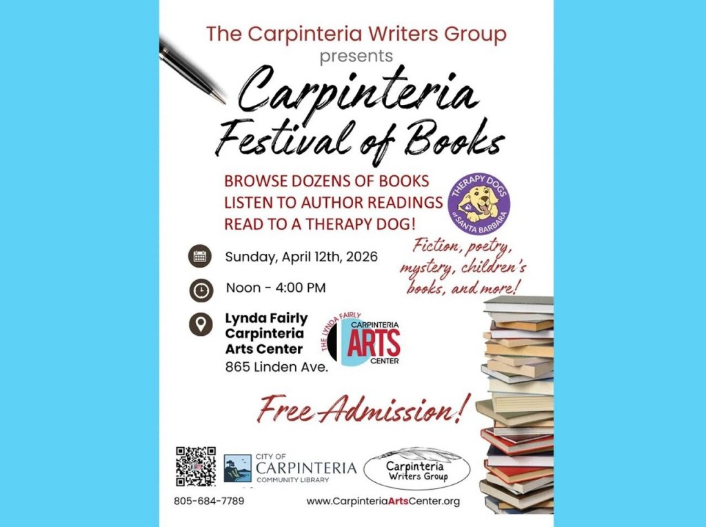 The event also features live author readings and the opportunity to read with Therapy Dogs of Santa Barbara. The free festival runs from noon to 4 p.m. rain-or-shine and is presented by the Carpinteria Writers’ Group and Lynda Fairly Arts Center, with support from the Carpinteria Community Library and Therapy Dogs of Santa Barbara.