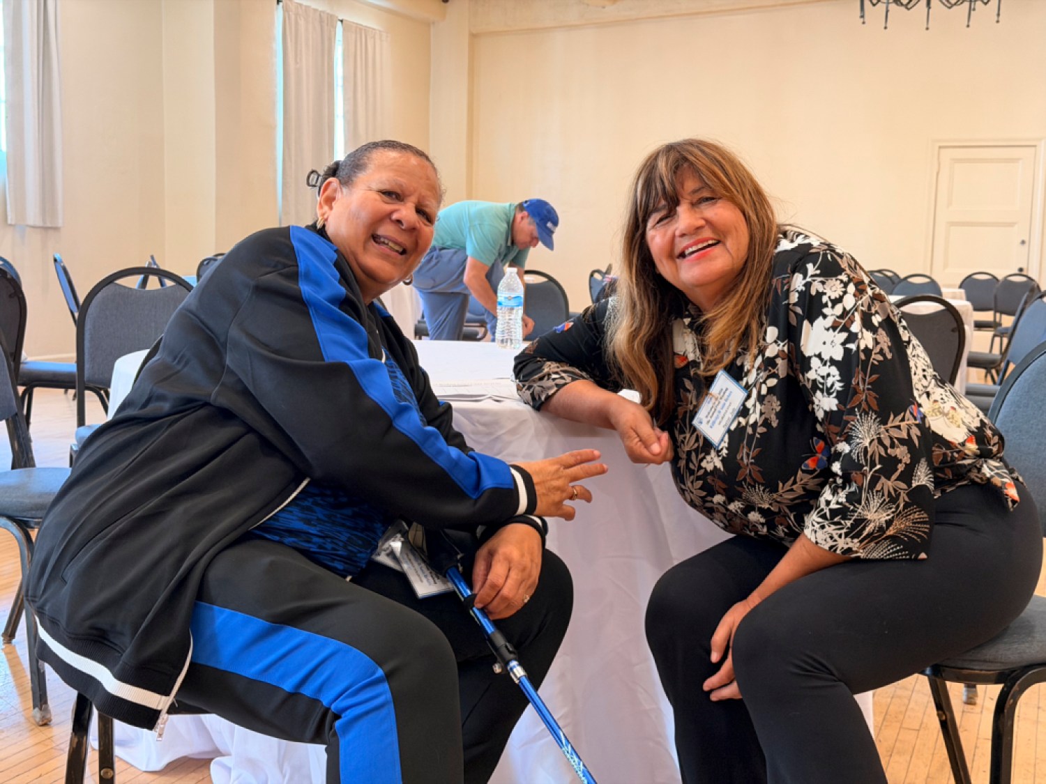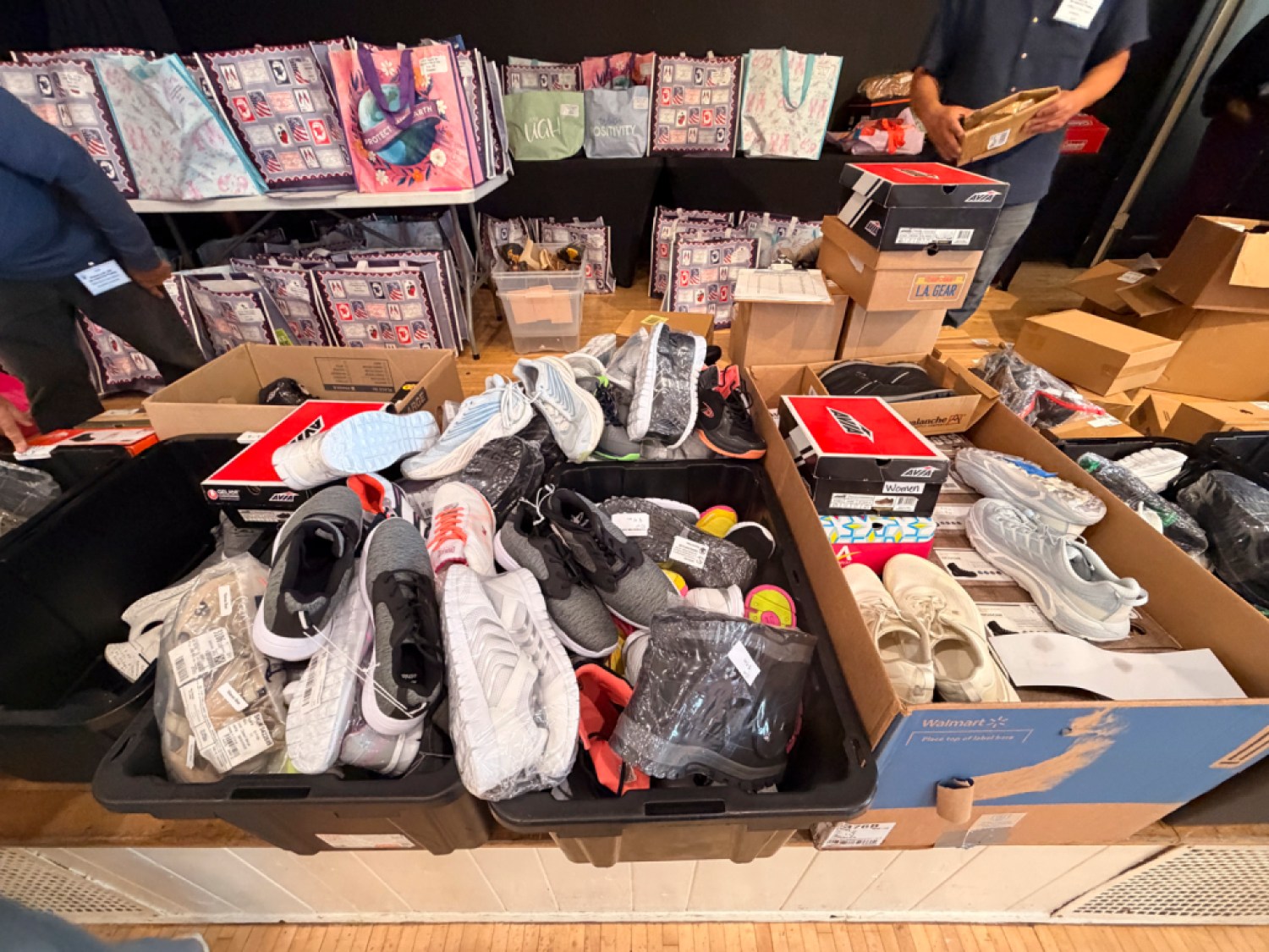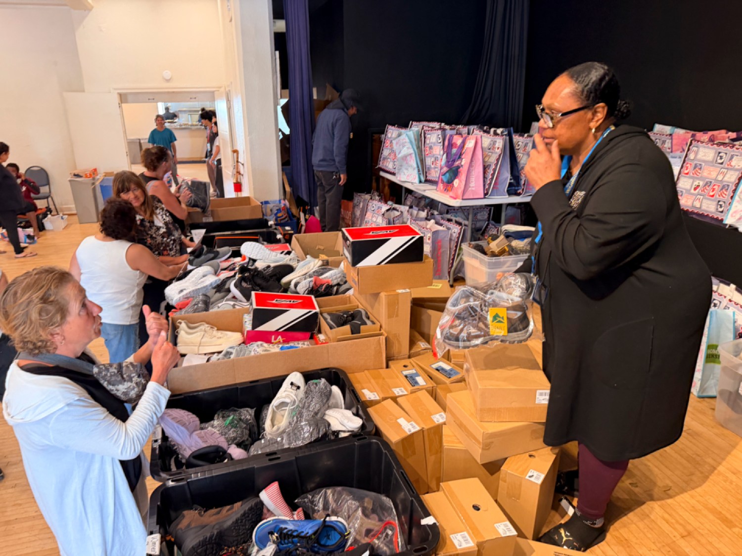 At the start of the event, folks were lined up in front of the Veterans’ Memorial Building. First, people were able to check their bags or carts in a secure location before being welcomed into the main hall and being seated at tables where volunteers would bring them a new pair of shoes and socks.